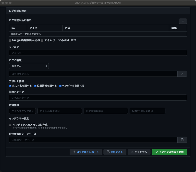 Creates an index in memory for the full-text search engine Bluege.Loaded logs will also be saved in memory.It disappears when you exit the program.If you load a large amount of logs, you will naturally run out of memory.If not checked, create an index in the working folder.