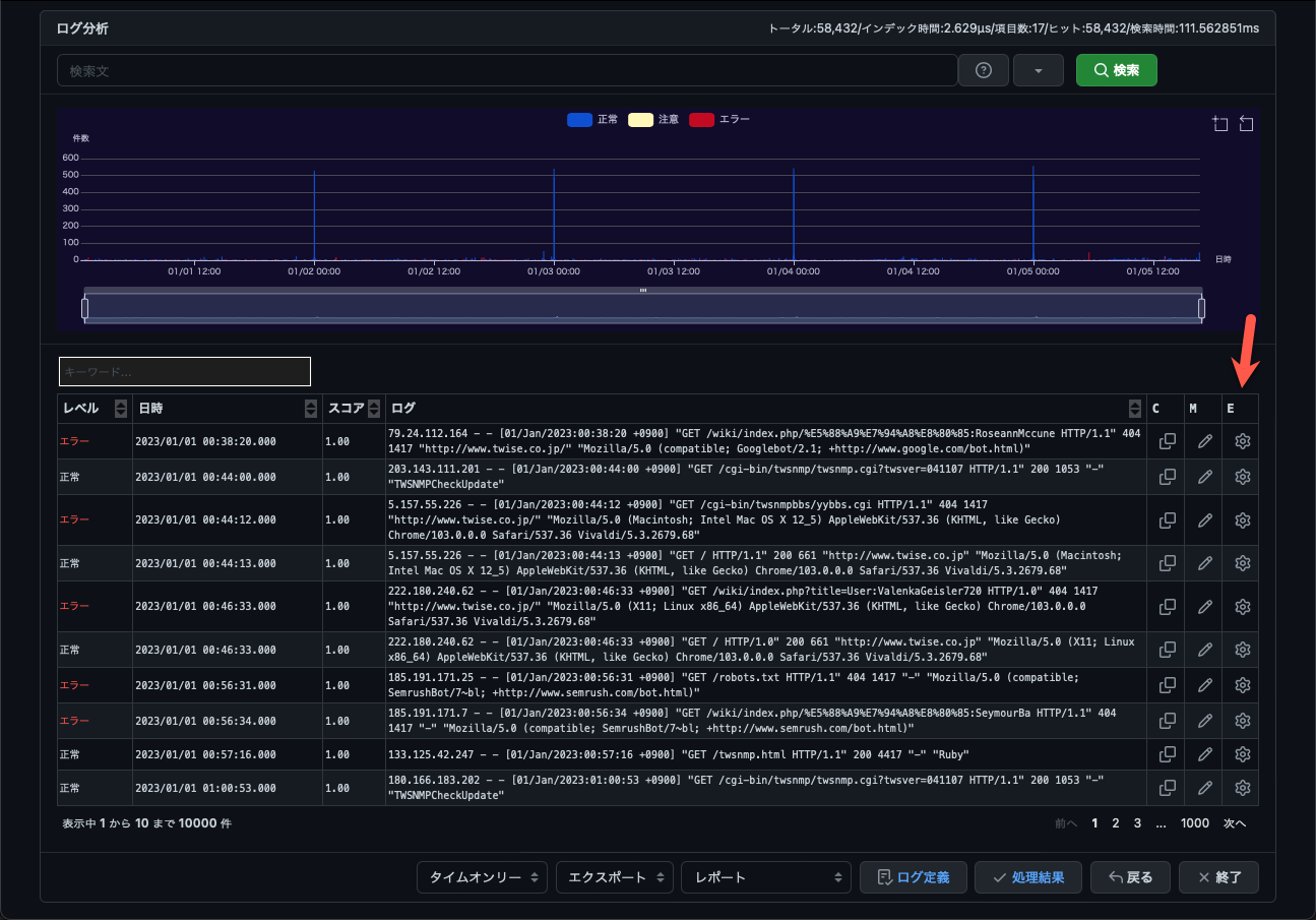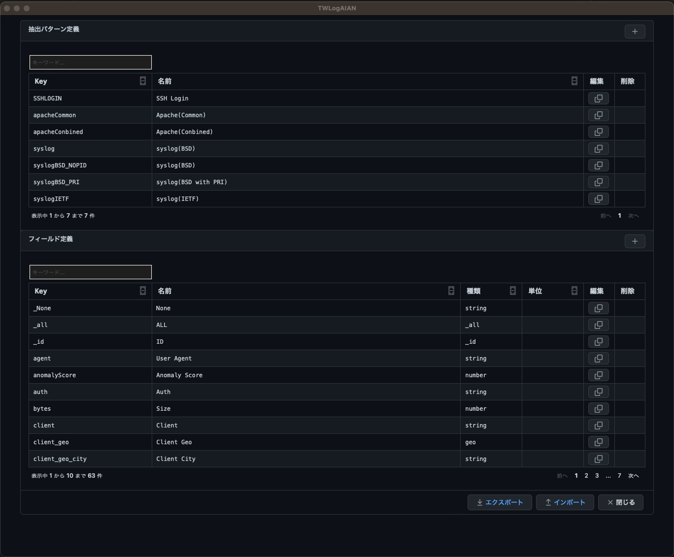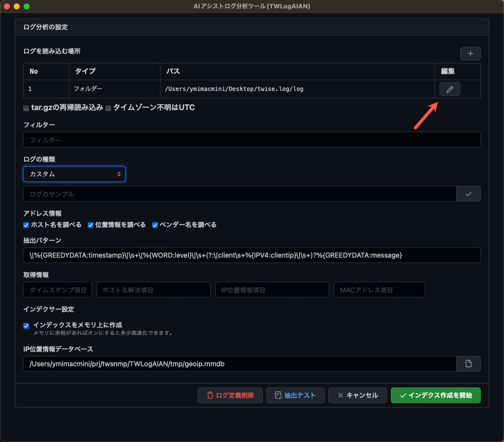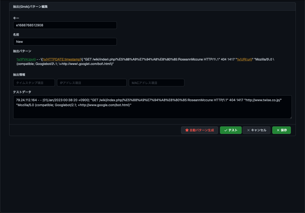 TWLogAIAN has a function that makes it easy to create Grok patterns.Click the E (edit) button to the right of the log to display a screen for editing the Grok pattern.