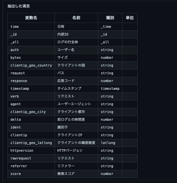 extractortypes is the definition of the log.key is the value that the definition identifies.name is a name for humans, and grok is the pattern.This is the variable name that tilefield recognizes as a timestamp, and ipfileds uses as IP addresses for hostname search and location search.The variable name that macfields uses to search for vendor names from the MAC address.fieldtypes is the definition of the variable.key is the variable name.name is the name for a human, and type is the type of the variable.Specify a number (number) or a string (string).unit is the unit that is displayed in the graph.