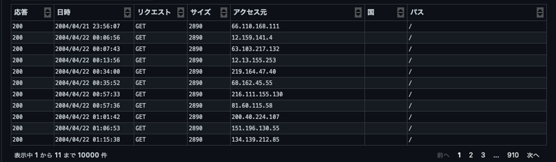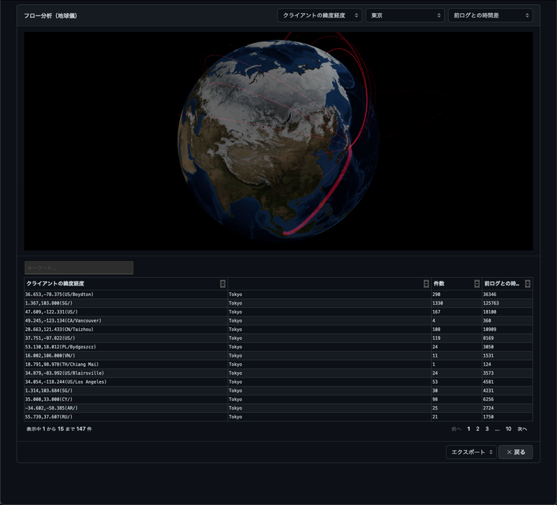 This is a report that searches location information from the IP address extracted from the log and displays communications on a globe.It has a demo effect, but I don’t think there’s anything that looks very good.