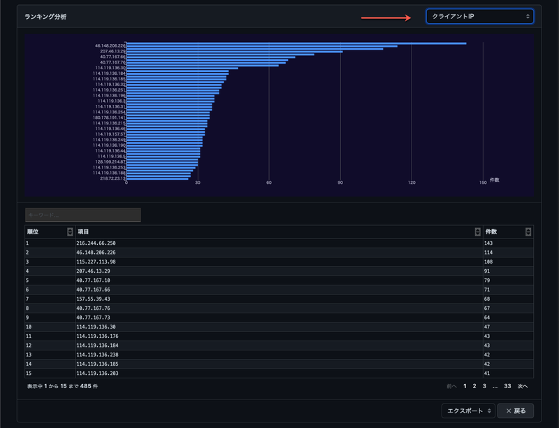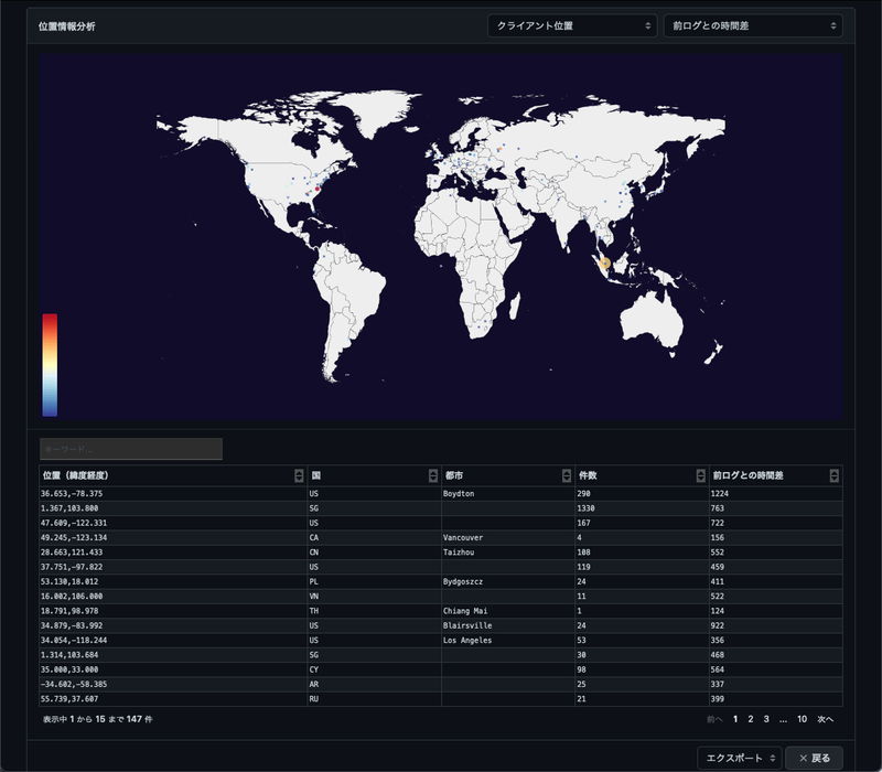 This is a report that searches and displays location information from the IP address in the log.In the menu on the top right, specify the location information item and the numerical data item to be color-coded.Double-click on a dot on the map to display Google Maps.