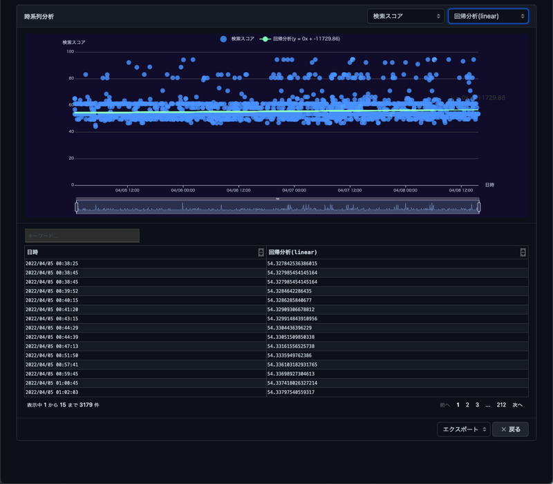 Displays the regression analysis using the selected method of numerical data.In linear, it calculates a and b of equations such as y=ax+b and displays a line graph.The example on the right doesn’t really make much sense.For data indicating free disk or memory, you may be able to calculate the rate at which it will decrease.