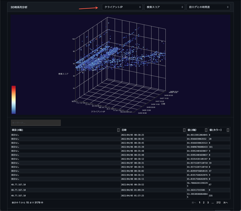 This is a report that displays numerical data extracted from the log in a time series 3D graph.The Y-axis is fixed time.You can select X, Z, and color-coded items from the menu in the upper right corner.You can change your perspective by dragging 3D graphs. * “There are things that cannot be seen in the 2d graph”** The assistant cat said from heaven.