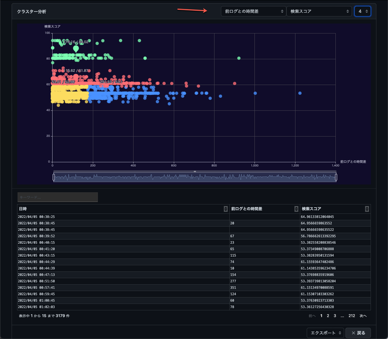 This is a report that displays the results of cluster analysis using numerical data extracted from logs.In the menu on the top right, specify the number of clusters to be classified as two numerical items for cluster analysis.There may be something that can be seen in cluster analysis.