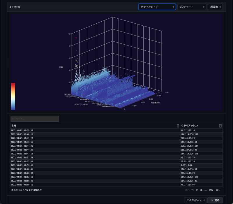 You can switch between items to be aggregated, graph type, frequency and period in the menu on the top right.The 2D graph shows the access period from a specific IP address.