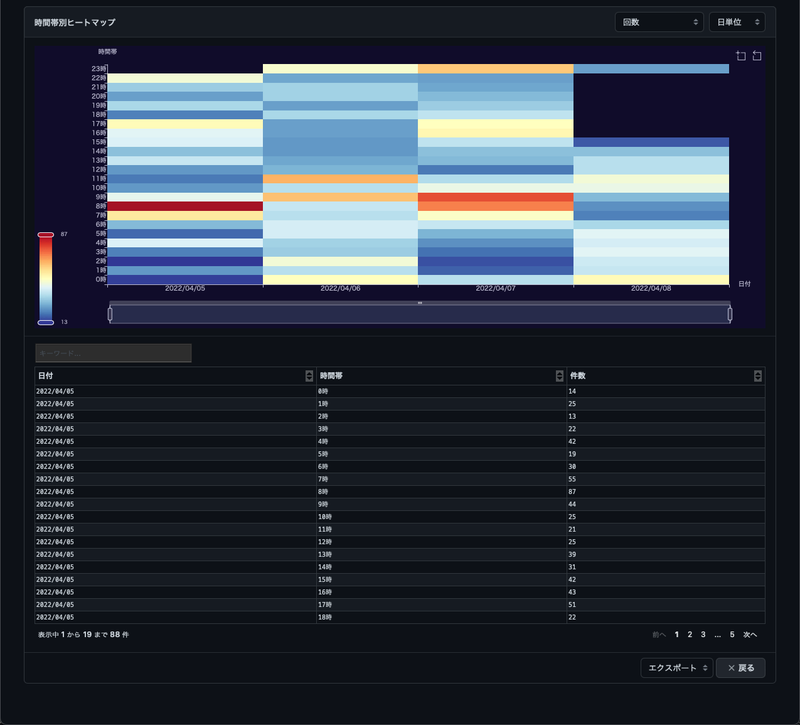 This is a report that displays the number of logs, etc. in a heat map of the time zones per day and the day of the week.It seems that there are a lot of logs on Mondays at 9am.You can select the items to be tallied and the display format in the menu at the top right.