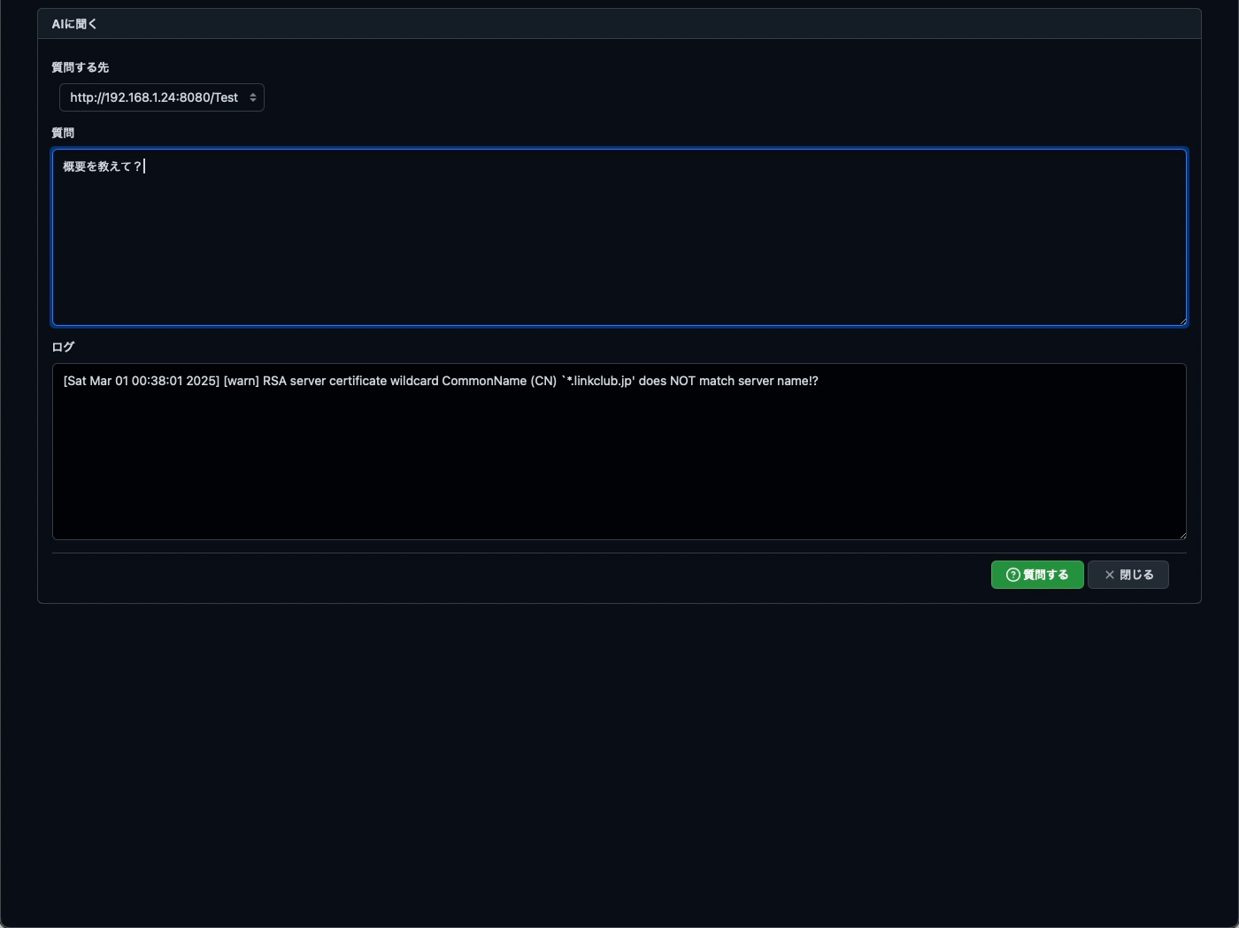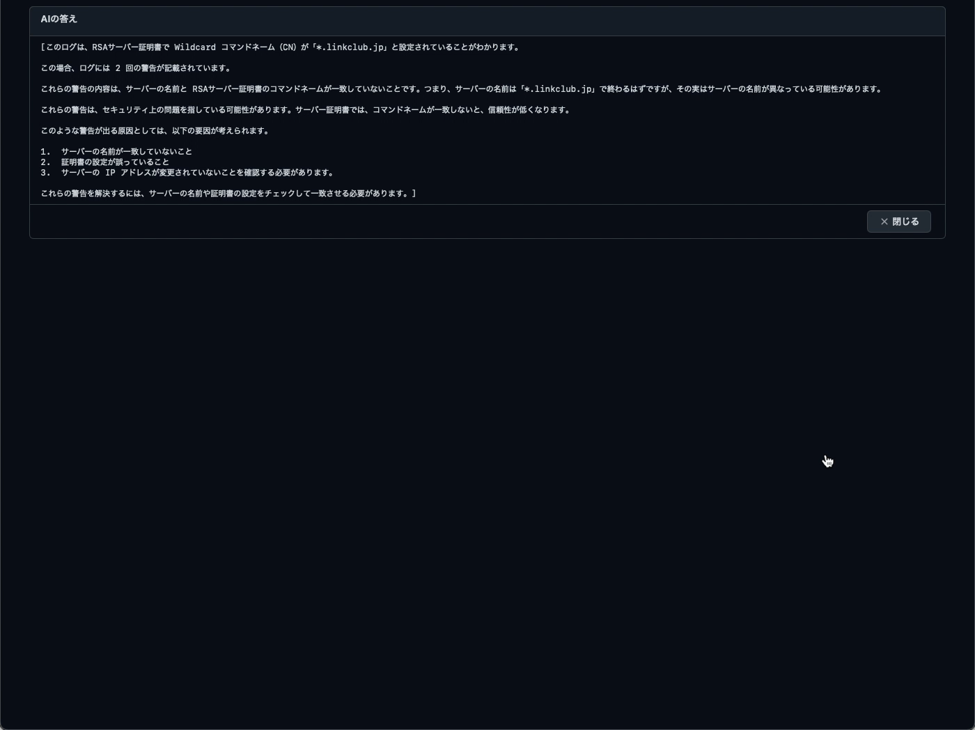 TWLogAIAN began development on New Year’s Day 2022 “A log analysis tool that AI assists me” is. The main purpose of developing this tool is to use it myself in practice.The main purpose is to use it for log analysis to investigate problems with software being developed and maintained.We create the best tools for this purpose.