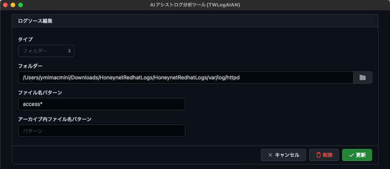 作業フォルダーを選択するとログ分析の設定画面が表示されます。 最初に、ログを読み込む場所の設定をします。分析対象のログが何処にあるかを設定します。最初は<+>ボタンで追加できます。 この例だと指定のフォルダにあるファイル名がaccessから始まるもの対象です。